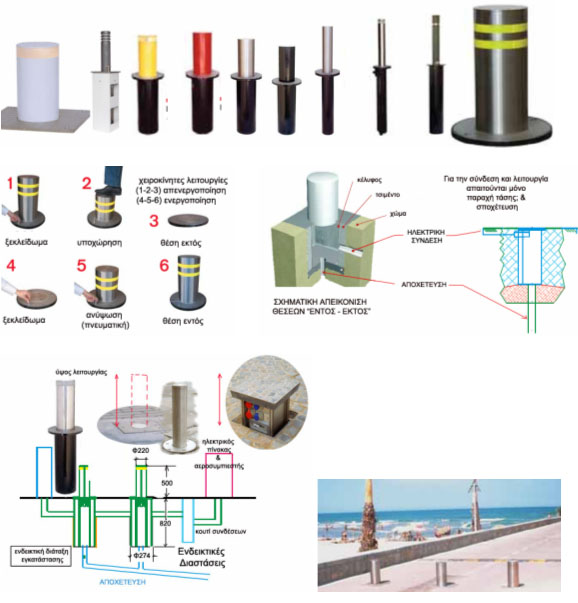 Stainless bollards static, abstractive with automatic, half – automatic and manually operated sinking that covers each need of programmed control of vehicle access (entries parking, areas of padestrians movement, public and private buildings) .